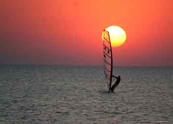 Отели Дахаба, в основном, расположены по берегу залива, отделенного от моря широкой косой. Природа создала в этом месте идеальные условия для занятий виндсерфингом. Здесь не бывает больших волн, но почти всегда дует ветер, без которого виндсерфинг невозможен. Обычно воды лагуны бороздят десятки досок с разноцветными парусами.